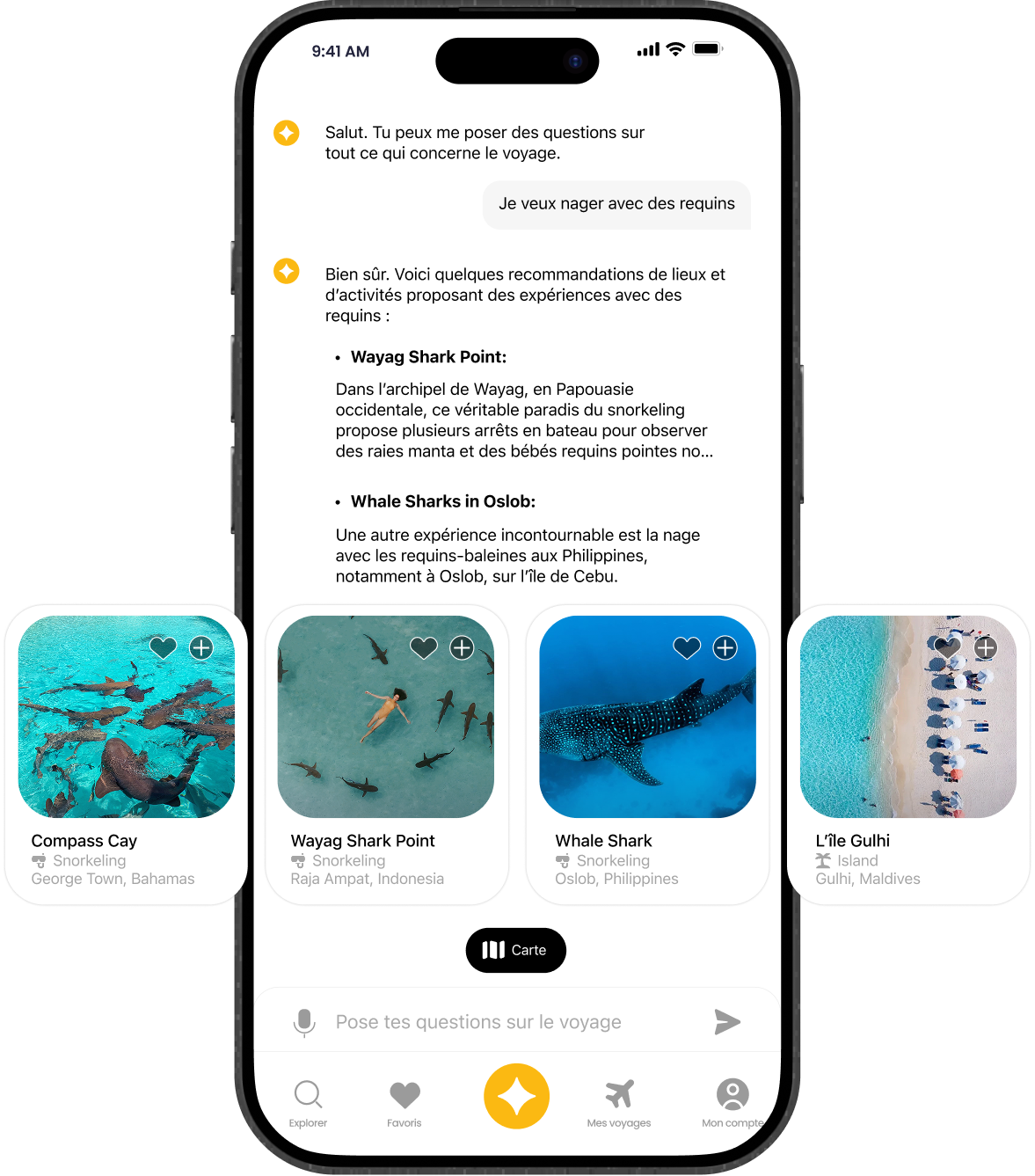 Wanderz est équipée d'un agent IA qui va te faciliter la vie. Envie d'un programme pour l'Indonésie avec plage et randonnée en famille? Tu cherches des hotels abordables à Tokyo? Tu veux des suggestions de destination pour nager en janvier? L'IA de Wanderz te proposera des milliers de recommandations de programmes, lieux, destinations en quelques secondes.